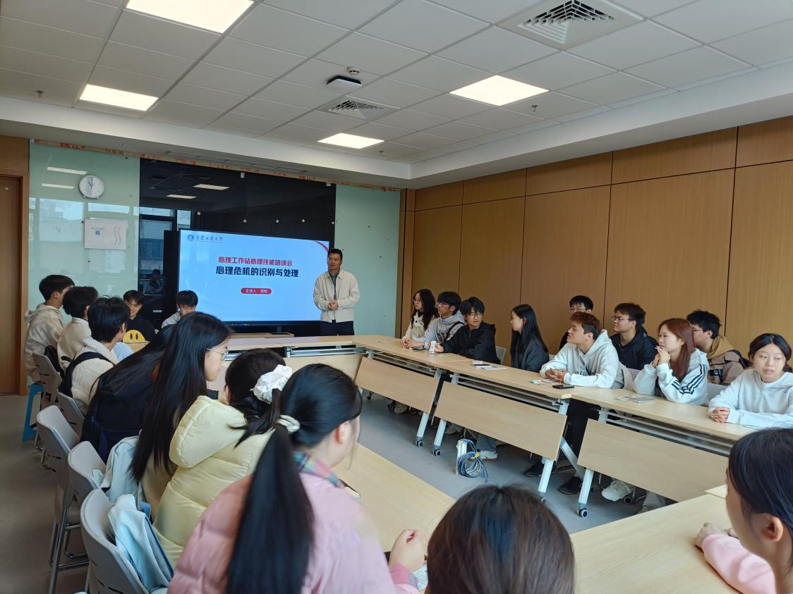 参观结束后,周明老师以《心理危机的识别与处理》为题,为同学们带来一场内容充实、实用性强的心理专题培训。培训中,周老师结合丰富的案例,深入浅出地为大家讲解了大学生常见心理问题的表现、心理危机的早期识别信号以及作为班级心理委员应采取的恰当应对措施和陪伴支持技巧等。他强调心理委员在基层信息沟通和朋辈支持中的“哨兵”与“桥梁”作用,鼓励大家主动关怀同学,及时上报异常情况,成为连接同学与学院、学校的重要纽带。