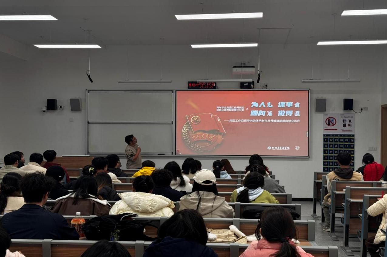 讲座中,邹奇组织员围绕“实用工具配合场景应用”这一核心理念,结合自身丰富的党团工作经验,为同学们带来全面而深入的分享。他聚焦党团汇报、活动策划、思想传播等常见工作场景,现场演示如何高效制作PPT、整合数字素材、优化多媒体展示,帮助同学们快速掌握提升信息传递效率的关键技巧。此外,邹奇组织员还结合典型案例,分析了当前党团工作中面临的痛点与难点,提出“工具助力与思维创新”双轮驱动的解决策略,为同学们拓宽了数字化时代党团工作的新思路。